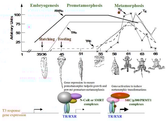 Extensive biochemical and molecular studies have shown that for T3-induced genes, TRs function mainly as heterodimers with 9-cis retinoic acid receptors (RXRs) and constitutively bind to T3 response elements (TREs) in target genes [28,30,31,38,39]. They repress the target genes in the absence of T3 but activate them when T3 is present by recruiting corepressor complexes and coactivator complexes, respectively, to target promoters [40,41,42,43,44,45]. These T3-dependent dual effects of TR on transcription, coupled with the developmental expression profiles of the TR genes in Xenopus laevis [35,46,47,48,49], have led to the proposal of a dual function model for TR during Xenopus development (Figure 2) [50]. According to this model, T3-inducible genes are expressed at basal levels during embryogenesis when there is little TR or T3 present. By the end of embryogenesis when a feeding tadpole is formed (stage NF45 according to the Xenopus developmental table, [51]), the expression of these genes is no longer needed and is thus repressed, in part due to the activation of the expression of TR and RXR genes, especially TRα and RXRα. As there is little T3 present in premetamorphic tadpoles, TR/RXR heterodimers binds to TREs in these target genes to recruit corepressors and repress their expression. Such gene repression helps to prevent premature initiation of metamorphosis and allows the tadpole to grow sufficiently before metamorphosis. When the endogenous T3 level rises after stage NF54 due to the activation of T3 synthesis and secretion, T3 binds to TRs, and the resulting liganded TR/RXR heterodimers in turn recruit coactivator complexes to activate the expression of target genes, leading to metamorphosis. While this model was proposed largely based on available information for Xenopus laevis, it is likely applicable toward at least other anurans, particularly the diploid Xenopus tropicalis, which is highly related to the pseudo-tetraploid Xenopus laevis, due to the conservation in TR function and temporal expression profiles of the TR genes [37].