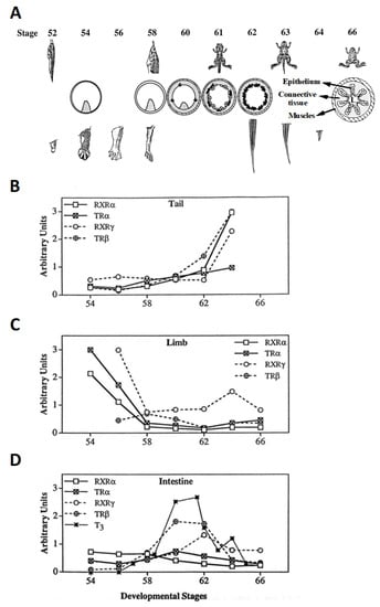The mechanism for the temporal regulation of metamorphosis of different organs is not fully understood. There is a TR subtype-dependent temporal correlation of TR expression with organ specific changes, at least in the limb, tail, and intestine in both Xenopus laevis and Xenopus tropicalis (Figure 3B) [37,49]. In the hindlimbs, the TRα mRNA level is high, while TRβ is low during limb morphogenesis (stages NF54-NF58). However, in the tail, the expression of both TR genes is low prior to any significant tail length reduction before stage NF60. During tail resorption (stages NF60-NF66), TRα expression is moderately increased, while TRβ expression is strongly upregulated, especially during stages NF62-NF64 when rapid tail length reduction occurs. Similarly, during intestinal remodeling, mainly between stages NF58-NF66, TRβ expression is strongly upregulated while TRα expression is increased slightly. Furthermore, there is also a temporal correlation, although somewhat weaker, of RXR expression with metamorphosis in these three organs (Figure 3B). Thus, TR may have subtype-dependent roles in the temporal control of organ-specific metamorphosis, most likely as TR/RXR heterodimers.