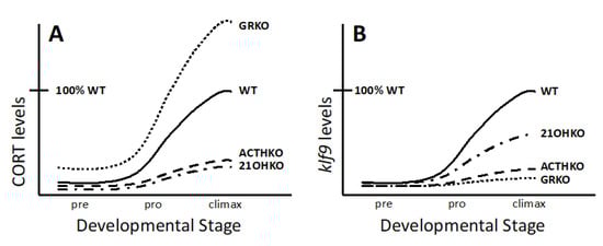 Levels of plasma CORT and klf9 expression in corticosteroid mutant frogs. (A). Compared to wild-type (WT) tadpoles, glucocorticoid receptor knockout (GRKO) tadpoles have high corticosterone (CORT) levels from lack of negative feedback, adrenocorticotropic hormone knockout (ACTHKO) tadpoles have low CORT levels from lack of adrenal stimulation by ACTH, and cyp21a2, encoding 21-hydroxylase, knockout (21OHKO) tadpoles have low CORT levels from lack of a steroidogenic enzyme to make CORT. (B). The expression of klf9 (Krüppel-like factor 9) is directly induced by CORT and by T3. The expression of klf9 is also indirectly increased by CORT via CORT’s action to increase tissue responsivity to T3. Thus, compared to WT tadpoles, 21OHKO tadpoles have reduced klf9 levels from reduced CORT signaling caused by lack of CORT but abundant CORT synthesis precursors able to bind CORT receptors with lower affinity. ACTHKO and GRKO have low klf9 levels from minimal to no contribution of CORT/GR signaling to induce klf9 via CORT signaling per se or via an increase in tissue responsivity to T3.