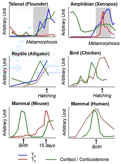 Metamorphosis is an emblematic type of post-embryonic developmental process. This life stage transition from one ecological niche to a different ecological niche is also present in various metazoan phylogenetic groups. Here, we will present the contributions of TH and CSs in metamorphosis and developmental transitions in other vertebrates, including larval and secondary metamorphosis in teleost fishes, egg hatching in sauropsids, and birth in mammals. Two neuroendocrine axes, the hypothalamic–pituitary–thyroid and the hypothalamic–pituitary–adrenal (mammals and sauropsids)/interrenal (amphibians and teleost fishes) axes, are central players in the regulation of these life transitions. To highlight the evolutionary conservation of these two axes, all vertebrates have both axes (Figure 1) with a peak of T3 and a peak of CSs that co-occur during post-embryonic development (Figure 5). In addition, similar T3 and CS concentration profiles are observed in certain birds and reptiles at hatching and during molting, as well as in certain teleost fishes at hatching and during larval metamorphosis and smoltification [114].