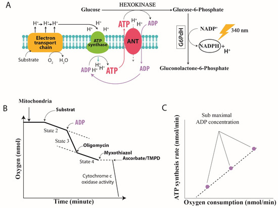 Assay chemistry and instrumentation. (A) The ATP:O ratio represents the ratio of ATP synthesis based on oxygen consumption measured simultaneously. It allows us to measure the efficiency of the oxidative phosphorylation. This ratio is determined using the “hexokinase system” based on the regeneration of ADP [17,25], thus making it possible to obtain a stable State 3. The intensity of State 3 can be modulated by increasing concentrations of ADP, resulting in the kinetics of ATP synthesis being obtained as a function of the consumption of oxygen between State 4 (the absence of ATP synthesis) and State 3 (maximum ATP synthesis). The reaction catalyzed by hexokinase (HK) is as follows: synthesized ATP is measured indirectly by evaluating glucose-6-phosphate production during the reaction. Glucose-6-phosphate dehydrogenase (G6PDH) allows the formation of NADPH from glucose-6-phosphate: HK glucose + ATP gGlucose-6-phosphate + ADP. The quantity of NADPH formed during this reaction can then be measured with a spectrophotometer at a wavelength of 340 nm and is directly proportional to the amount of ATP synthesized. (B) Typical trace of mitochondrial respiration. The respiration rate (determined by the slope of the curve) is calculated by the amount of consumed oxygen/minute/mg of protein. The State 2 non-phosphorylating state is respiration in the absence of ATP synthesis. State 3 is respiration in the presence of ATP synthesis. State 4 is the respiration in the presence of oligomycin, an ATP synthase inhibitor. Cytochrome c oxidase activity is the maximal respiration with ascorbate and N,N,N′N′-tetra methyl-p-phenylenediamine (TMPD) as a substrate. (C) ATP:O is the linear relationship between ATP production and oxygen consumption measured with the addition of different amounts of exogenous ADP. The mitochondrial ATP synthesis is initiated by the addition of different amounts of ADP. The intensity of State 3 can be modulated by increasing the concentration of ADP, resulting in the kinetics of ATP synthesis being obtained as a function of oxygen consumption between State 4 (absence of ATP synthesis) and State 3 (maximum ATP synthesis). There is a linear relationship between ATP synthesis and oxygen consumption when the oxidative phosphorylation rate increases by the addition of higher amounts of ADP.