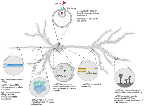 One of the immediate consequences of gp120 endocytosis is binding to the neuronal cytoskeleton (Figure 3). The neuronal cytoskeleton is crucial for the establishment and maintenance of spatial organization and architectural support of axons and dendrites. In addition, the cytoskeleton is crucial to preserve the functionality of intracellular transport and dendritic spines. The neuronal cytoskeleton is made of microtubules, actin, neurofilaments and their associated proteins. One of the components of neuronal microtubules is class III β tubulin (TUBB3). The C-terminal tail domain (CTT) of TUBB3 has a binding site for an α-helix motif of gp120 [90]. This binding occurs at nanomolar concentrations of gp120, suggesting that the binding of gp120 to the cytoskeleton is in a high-affinity range. This binding leads to several changes in cytoskeletal components and in particular to posttranslational modification of tubulin. In fact, it has been shown that gp120 reduces microtubule (MT) polymerization and acetylation of tubulin [73]. Reduced levels of tubulin acetylation cause axonal transport defects, as seen in various neurological diseases, such as Huntington’s disease [91] and Charcot–Marie–Tooth disease [92]. These defects can be reversed by restoring tubulin acetylation levels [93].