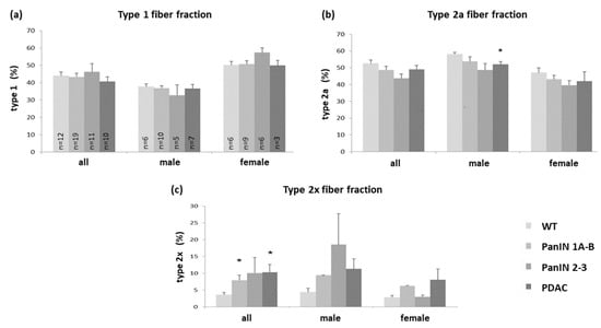 Fiber distribution (% fraction) of (a) type 1 (b) type 2a and (c) type 2x fibers in soleus muscle in the four groups WT, PanIN 1A-B, PanIN 2-3, and PDAC, with each panel (a–c) presenting data for the total study population, males or females as indicated. Mean ± SEM, * for p < 0.05 compared to WT.