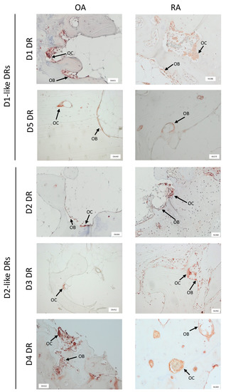 All dopamine receptors were detected in the bone tissue of OA and RA patients (Figure 1), whereas the overall expression of DR was higher in RA compared to OA. D1DR and D4DR expression was comparable in OA and RA patients and were detected both in osteoclasts and osteoblasts. The expression of D2DR and D3DR was very weak in OA and stronger in RA, where the receptors were detected both in osteoclasts and osteoblasts. D5DR expression was weak in both patient cohorts.