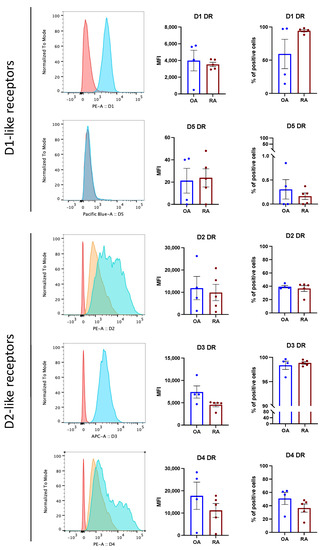 Isolated osteoblasts in culture maintained DR expression, as detected via FACS analysis (Figure 2). No significant differences between OA and RA were observed. The expression of D5DR was extremely weak, thus confirming the histological staining, and the expression of D2-like DR was overall stronger than D1-like DR expression.