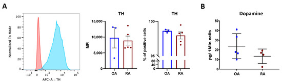 Dopamine synthesis in isolated osteoblasts. Tyrosine hydroxylase (TH), the rate-limiting enzyme for dopamine synthesis, was quantified in isolated osteoblasts at passage 3. (A): Representative histograms (left) showing TH expression in RA. Red: unstained control; blue: TH staining. Right: mean fluorescence intensity (MFI) and % of positive TH-stained cells in OA (blue bars) and RA (red bars). Histograms represent mean ± SEM. Each point represents one patient. OA n = 4, RA n = 5. (B): Quantification of dopamine content in cell lysates at passage 3, indicated as picogramm (pg) in one million (Mio) cells. Each point represents the mean value of duplicate measurements of one patient. OA n = 5, RA n = 4.