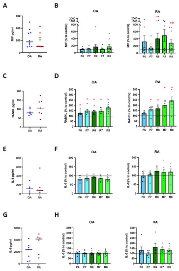 Cytokine release after DR stimulation of activated osteoblasts. Isolated osteoblasts were cultured for 3 weeks with mineralization medium, and afterwards for further 24 h in presence of specific DR agonists. Afterwards, cytokines were measured in culture supernatants. (A): basal amount of macrophage migration inhibitory factor (MIF) in OA and RA patients. (B): quantification of MIF in OA (left) and RA (right) patients expressed as percentage to control without DR agonist. (C): basal amount of receptor activator of nuclear factor-κB ligand (RANKL) in OA and RA patients. (D): quantification of RANKL in OA (left) and RA (right) patients expressed as percentage to control without DR agonist. (E): basal amount of interleukin 8 (IL-8) in OA and RA patients. (F): quantification of IL-8 in OA (left) and RA (right) patients expressed as percentage to control without DR agonist. (G): basal amount of interleukin 6 (IL-6) in OA and RA patients. (H): quantification of IL-6 in OA (left) and RA (right) patients expressed as percentage to control without DR agonist. OA n = 4–5, RA n = 3–7. C = control; F = Fenoldopam; R = Ropinirole; 6 = 10−6 M; 7 = 10−7 M; 8 = 10−8 M. Single dots represent mean value of individual patients. Histograms show mean and SEM. Raw data were used for statistical analysis with Wilcoxon matched pairs signed rank test.