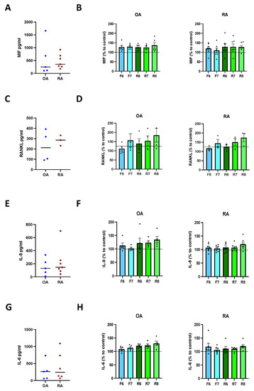 To find out if dopamine also influences the cytokine release of activated osteoblasts, we firstly induced mineralization for 21 days as described above, and then stimulated DR for 24 h. Our results demonstrate a similar amount of MIF, RANKL, IL-8, and IL-6 release in OA and RA osteoblasts (Figure 6A,C,E,G). DR stimulation did not affect the release of MIF (Figure 6B), RANKL (Figure 6D), IL-8 (Figure 6F), and IL-6 (Figure 6H) in both groups.