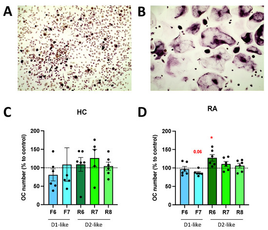 A culture of PBMC with osteoclast differentiation medium for 14 days induced osteoclast differentiation (Figure 7A,B). The stimulation of D2-like DR with ropinirole 10−6 M during differentiation significantly increased osteoclast differentiation in RA, whereas D1-like DR stimulation tended to inhibit osteoclastogenesis (Figure 7D). No significant effects of DR stimulation were observed in HC (Figure 7C).