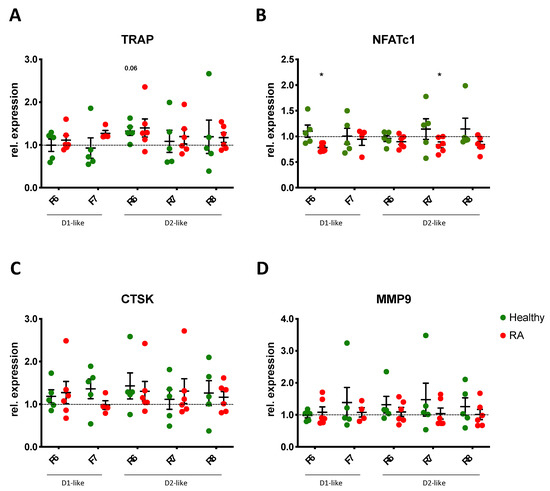 DR stimulation does not alter gene expression of OC markers. Expression of tartrate resistant phosphatase (TRAP, (A)), nuclear factor of activated T-cells, cytoplasmic 1 (NFATc1, (B)), cathepsin K (CTSK, (C)) and matrix metalloprotease 9 (MMP9, (D)) were analyzed by real-time PCR in PBMCs of healthy controls (green dots) and RA patients (red dots) cultured with OC differentiation medium for 14 days in the presence or not of DR agonists. Values are normalized to GAPDH expression as reference gene and presented as relative expression to control without DR agonist. HC n = 5, RA n = 4–6. F = Fenoldopam; R = Ropinirole; 6 = 10−6 M; 7 = 10−7 M; 8 = 10−8 M. Single dots represent mean values of duplicates for individual patients. * = p < 0.05 calculated by Wilcoxon matched pairs signed rank test compared to untreated control.