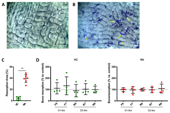 To further investigate possible effects of DR-stimulation on OC function, we also investigated bone resorption (Figure 9A,B). Osteoclasts differentiated from RA PBMCs induced significantly more bone resorption than osteoclasts differentiated from HC subjects (Figure 9C), but DR stimulation had no effects on bone resorption in both cohorts (Figure 9D).