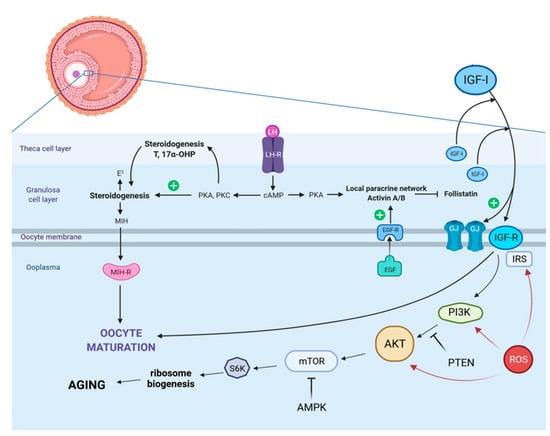 This scheme shows the influence of IGF1 on the maturation and aging process of oocytes. In vivo, the maturation of oocytes is stimulated by the pre-ovulatory surge of the luteinizing hormone (LH). The LH binds to LH receptors on mural granulosa cells and generates the production of specific epidermal growth factor-like peptides that transmit signals to the cumulus cells and the oocyte itself. The gonadotropins are commonly combined with epidermal growth factor (EGF) or EGF-like factors that are produced by follicular cells. It has been convincingly demonstrated that insulin-like growth factor 1 (IGF1) enables the maturation of oocytes and aging through a phosphoinositide-3-kinase/v-akt murine thymoma viral oncogene homolog (PI3K/AKT)-dependent mechanism. Abbreviations: AMPK: activated protein kinase; GJ: gap-junctions; IGFR: insulin-like growth factor receptor; IRS: insulin receptor substrate; MIH: maturation-inducing hormone; MIH-R: maturation-inducing hormone receptor; mTOR: mammalian target of rapamycin, PTEN: Phosphatase and Tension Homolog; ROS: reactive oxygen species; S6K: S6 kinase; green plus: positive/activating effect; red arrows: negative effect.