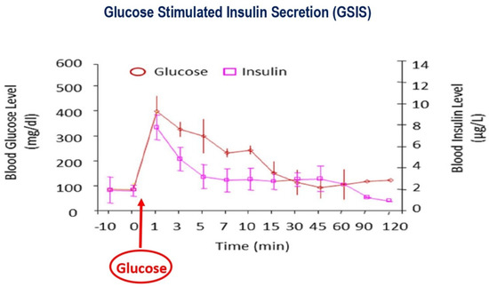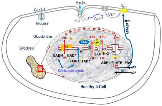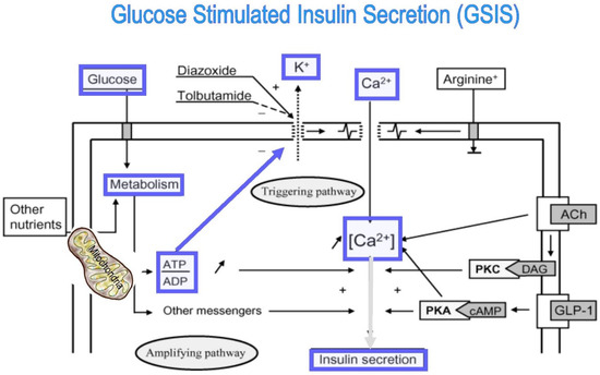 Pancreatic β-cells are sensitive glucose sensors that adjust precise quantities of insulin release to variations in blood glucose levels critical to ensure adequate entry of glucose and homeostasis. The process of glucose-stimulated insulin secretion (GSIS) is exceptionally dependent on mitochondrial function (Figure 2 and Figure 3) [3,10,11,12,13,14,15,16,17].
