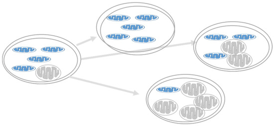Human mitochondrial DNA (mtDNA) is a circular, double-stranded, supercoiled molecule that encodes 37 genes, essential for OXPHOS and mitochondrial protein synthesis [49]. There are approximately 1000 mitochondrial genomes in most cells, and their replication is independent of the cell cycle. mtDNA has a 10–20 times higher replication rate than nuclear DNA (ntDNA), which can explain the much higher rate of sporadic mutations in mtDNA. It is common for mutations to affect only some of the hundreds of mitochondria copies in the cell, leaving many unaffected. Heteroplasmy is the presence of more than one type of mitochondrial DNA within one cell (Figure 6). A biochemical threshold is associated with an increased mutant mtDNA percentage causing decreased OXPHOS function and phenotype onset, as described in classical mitochondrial diseases explaining the different phenotypes for comparable mutations and the other ages of onset, as well as the severity of the disorder [50,51]. In β-cells, the tight coupling between glucose metabolism and insulin secretion is exclusively dependent on the mitochondria to generate sufficient ATP production required for insulin secretion. This is a pivotal situation in β-cells because increasing mitochondrial function ensues reactive oxygen species (ROS) production, which has a deleterious effect on its function. β-cells are highly sensitive to oxidative stress due to their low antioxidant defense mechanism, the lack of protective histones, and poor DNA-repair mechanisms [52,53,54]. Thus, the accumulation of mtDNA mutations in β-cells could increase the prevalence of mitochondrial-related reduced GSIS and T2D [14,50].