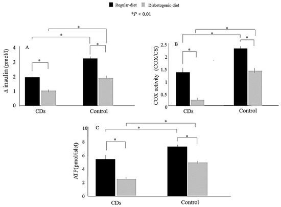 (A) Glucose-stimulated insulin secretion (GSIS), (B) cytochrome c oxidase (COX) activity, and ATP content (C) in islets isolated from Cohen diabetic sensitive (CDs) rats or control rats fed either a regular diet (black bars) or a diabetogenic diet (gray bars). (A) GSIS measured at 1.7 (baseline) and 16.7 mmol/L (stimulatory) glucose concentrations. (B) COX activity normalized to citrate synthase (CS) activity (COX/CS). (C) ATP content (pmol/islet) determined by luciferin luciferase. Data are means ± SE for at least three separate experiments. * p < 0.01. Figure is used and modified from [45] with permission from the publisher.