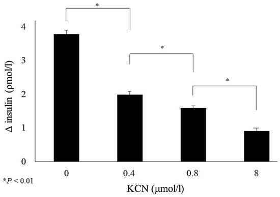 Glucose-stimulated insulin secretion of islets isolated from control rats fed a regular diet and incubated for 1 h with either 0, 0.4, 0.8, or 8 mol/L potassium cyanide (KCN) in the presence of 1.7 (baseline) or 16.7 mmol/L (stimulatory) glucose. The figure expresses insulin secretions measured as insulin secreted under stimulatory glucose minus insulin secreted under baseline glucose concentrations per islet of insulin content. Data are means ± SE for at least three separate experiments, * p < 0.01. Figure is used from [45] with permission from the publisher.