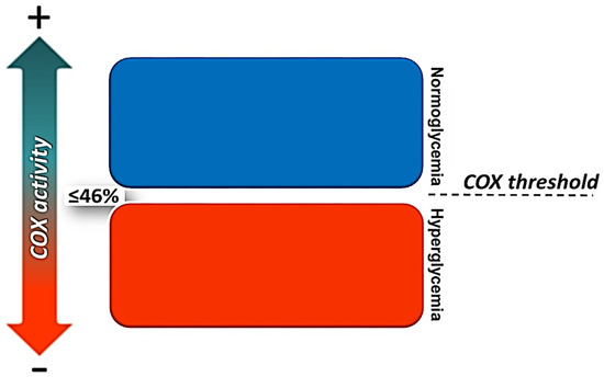 In a recent study, we linked reduced mitochondrial COX activity in islets, insulin secretion, and glucose homeostasis. We demonstrated that hyperglycemia was initiated when islet-COX activity decreased below 46% of baseline, identifying a novel islet-COX activity threshold required to sustain normoglycemia (Figure 11). We demonstrated a progressive reduction in COX activity in CDs islets that correlated positively with the decreasing GSIS (R2 = 0.9691, p < 0.001) and inversely with the elevation in blood glucose levels (R2 = 0.8396, p < 0.001), suggesting that islet-COX activity could be a significant metabolic sensor in pancreatic β-cells. Our studies concluded that: (1) islet-COX activity is directly associated with GSIS; (2) pancreatic inflammation reduced GSIS via NO production triggered by IL-1β secreted from peri-islet-infiltrating macrophages; (3) COX activity was markedly reduced in hyperglycemic CDs due to a pre-existing inborn (primary) impairment in mitochondrial respiratory chain dysfunction setting the initial islet-COX activity at ≤46% of baseline, thus enabling an almost complete inhibition of islet-COX activity, diminished GSIS and increased blood glucose levels.