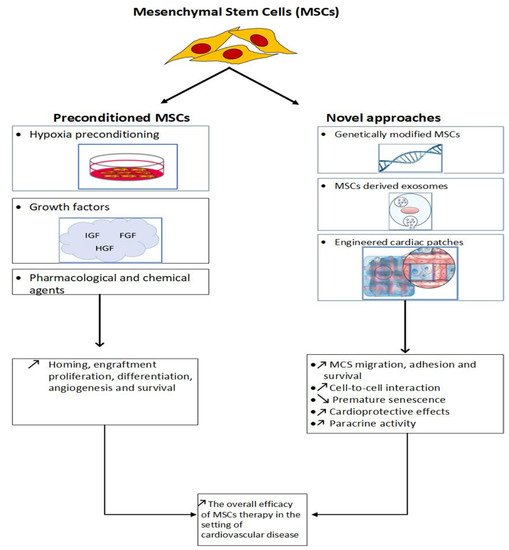 To conclude, transplantation of pre-conditioned MSCs results in better therapeutic efficacy in the setting of cardiovascular disease, especially with moderate hypoxia pre-conditioning. In parallel, the available novel techniques are able to overcome the limitations (MSCs homing ability, engraftment and survival) of this regenerative medicine, promoting stronger cardiovascular outcomes. Starting translational engineered cardiac patch practice from pre-clinical trials in animal models to in-human trials may change our future management of heart failure.