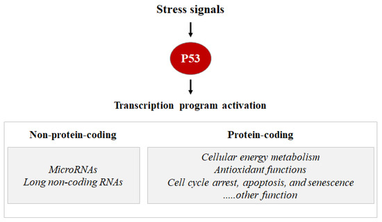 Stress signals can lead to P53 activation. Consequentially, the P53 can induce the transcription activation of coding proteins, ranging from the induction of cell cycle metabolism control, antioxidant functions apoptosis, senescence, cell cycle arrest, and DNA repair, or the P53 can induce the transcription activation of non-coding proteins such as microRNA and long non-coding RNAs.