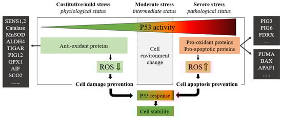 P53 protein plays a critical role in maintaining cellular energy metabolism by controlling oxidative phosphorylation and downregulation of glycolysis. Loss of P53 results in the deficiency of mitochondrial oxidative phosphorylation and enhanced glycolysis in both cultured cells and mouse models [4]. Another important function of P53 is to improve antioxidant defense by reducing ROS levels. To exert its antioxidant function, P53 induces a group of antioxidant genes, including a stress-inducible protein that regulates metabolism such as SESTRINs (SENS1, 2), TIGAR, GPX1, ALDH4, GLS2, and MnSOD, especially under conditions of non-stress or constitutive/mild stress, to lower ROS levels and prevent DNA damage [4]. Remarkably, in addition to antioxidant roles, P53 may exert a prooxidant effect via the upregulation of prooxidant genes, including PIG3, PIG6, FDXR, BAX, and PUMA [4]. Exposure of cells to high levels of ROS leads to oxidative stresses, which induce the P53 response (Figure 2).