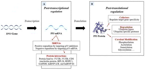 The P53 mRNA can be regulated post-transcriptionally (A) by miRNAs and RNA-binding proteins (RBPs) which modify the P53 transcriptional program in a stimulus-specific manner. The P53 miRNA regulation can be positive if miRNAs bind P53 inhibitors or can be negative if the miRNAs target is P53 mRNA. In addition to miRNA action, the P53 post-transcriptional program is also co-regulated, both negatively and positively, by RBPs that bind 5′UTR; 3′UTR; CDS of TP53. Some proteins modify P53 post-translationally. The figure (B) shows the P53-modifications of specific amino acid residues divided into Covalent Modification, Ubiquitination, and cofactors.