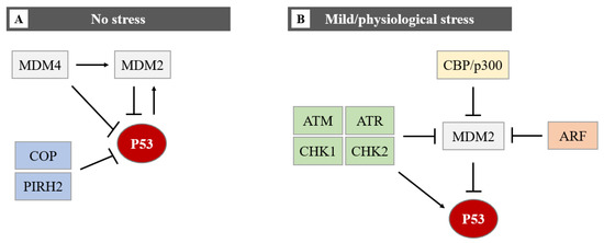 The regulation of the P53 protein level in cells in no stress and mild/physiological stress. During no stress (A), E3-ubiquitin ligases (MDM2, COP, and PIRH2) inhibit P53 activity through polyubiquitination and proteasome degradation. The function of P53 and MDM2 is regulated by a negative feedback loop. MDM4 can bind directly to P53 by repressing P53 transcriptional activity, or it can promote MDM2-mediated degradation of P53. The MDM2-P53 association promotes the degradation of P53 because physiological degradation of P53 is ubiquitin-dependent and MDM2 acts as a P53-specific E3 ubiquitin ligase. In conclusion, as MDM2 expression is positively regulated by P53, MDM2 drives P53 proteasomal degradation, it becomes apparent that MDM2 and P53 form an autoregulatory loop. In this loop, MDM2 restrains P53 levels under normal physiological conditions. Under mild/physiological stress states (B), MDM2 levels are kept low by ATM, ATR, CHK1 and CHK2, ARF, and CBP/p300. The low level of MDM2 induces the expression of P53. In the presence of mild/physiological stress, the level of these proteins increases.
