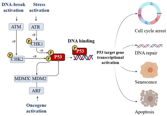 The signal that induces P53 activation is its phosphorylation (+P) which is triggered by DNA breakage activation (ATM), stress activation (ATR), and oncogene activation (ARF). Phosphorylation stabilizes P53 and promotes DNA binding. DNA-bound P53 then recruits the transcriptional machinery to activate the transcription of P53 target genes able of inducing cell cycle arrest, DNA repair, senescence, and apoptosis.