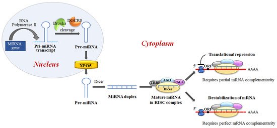 MiRNAs biogenesis is a complex process, which includes several crucial steps including transcription of primary (pri)-miRNAs; cleavage of pri-miRNAs to form precursor (pre)-miRNAs; and finally, cleavage of pre-miRNAs to form mature miRNAs [27] (Figure 6).