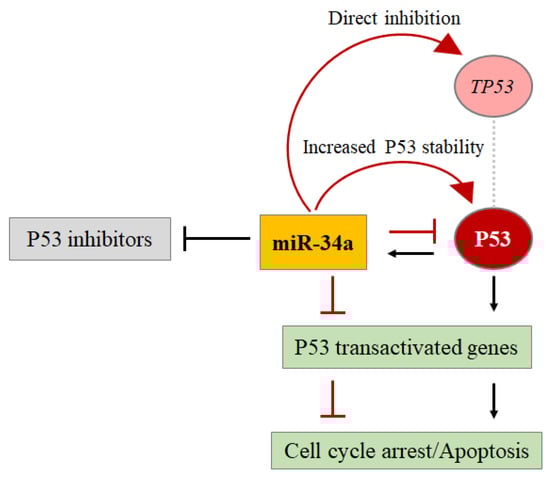 Additional anti-proliferative effects of miR-34a are reached by the repression of growth factor receptor tyrosine kinases (RTKs) and their downstream kinase pathways. miR-34a directs the cell towards apoptosis, targeting the BCL2 oncogene. In turn, BCL2 inhibits BH3 pro-apoptotic proteins, such as PUMA, blocking the activation of the intrinsic apoptotic pathway [5]. Navarro and Lieberman advanced an interesting theory on the regulation between miR-34a and P53 explaining that competing negative and positive feedback loops determine the net effect of miR-34a on P53 function. The authors argue that the activation of P53 by cellular stress leads to the transcription of miR-34 miRNAs. This miRNA improves P53 function via inhibition of multiple negative regulators to increase P53 transcriptional activity, an increase in protein stability (miR-34a feed-forward loop), inhibition of protein function, and direct inhibition of TP53 or many P53-activated genes (negative feedback loop). The net effect of miR-34a on the P53 response depends on the relative importance of these pathways, which is determined, under physiological conditions, by differences in cell gene expression concerning the organism and the living environment [45] (Figure 7).