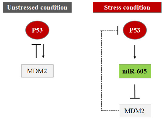As already mentioned, MDM2 is a key repressor of P53 activity; it is also a P53 transcriptional target and creates a negative feedback loop that keeps P53 levels and activity under strict control. Multiple miRNAs can interfere with this P53-MDM2 regulatory circuit by targeting and repressing the MDM2 mRNA to increase P53 activity in cells under stress conditions. Several miRNAs targeting MDM2 have been identified, including miR-192/194/215, miR-143/145, miR-29b, and miR-605. Interestingly, among these miRNAs, miR-192/194/215, miR-143/145, and miR-605 are transcriptionally regulated by P53, and in this way, they form a positive feedback loop with P53. Through this control, P53 promotes the transcription of these miRNAs which in turn target and repress MDM2 resulting in an upregulation of the P53 level. miR-605 can be evaluated as a new regulatory molecule of P53–MDM2 interaction. MiR-605 switches the P53–MDM2 negative feedback loop into a positive feedback loop by promoting a rapid accumulation of P53 to facilitate its function in response to stress. In conditions of physiological stress, the expression of miR-605 is enhanced by P53 activation; consequently, the upregulation of miR-605 increases the transactivation activity of P53 by repressing MDM2 and thereby reducing the inhibition of MDM2 on P53. Through a positive feedback loop, miR-605 allows the rapid accumulation of P53 and cell cycle arrest or apoptosis [56,57,58] (Figure 8).