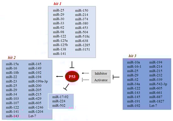 Schematic mechanism of P53–miRNA interaction at multiple levels. MiRNAs directly target P53 by binding the 3′UTR of P53 mRNA. The interaction downregulates the translation of P53 mRNA (hit 1). In a regulatory circuit P53 increases or decreases the expression of miRNAs by inhibiting regulators (hit 2). Furthermore, some miRNAs targeting P53 regulators vary P53 outcomes (hit 3). If the regulators are positive, P53 outcomes culminate in decreases, or, on the other hand, negative regulators lead to a P53 increase.