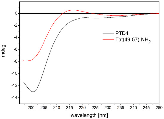 Since peptide conformation-based interactions with the neuronal cell membrane may contribute to the neuroprotective properties of RRCPPs, we performed CD spectroscopy to investigate the conformational behavior of Tat(49–57)-NH2 and PTD4 peptides during their interaction with ANM liposomes. The composition of liposomes mimicked that of lipids on the natural neuronal membrane [14,15,35].