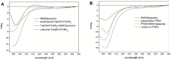 Similar changes were also observed in the case of the PTD4 peptide (Figure 2B). The decrease of the minimum at λ ≈ 200 nm was more intense compared to the Tat peptide, and virtually no changes were noted in the long-wavelength part of the CD spectrum. Based on a comparison of the CD curve of the unbound PTD4 peptide with that obtained as a result of subtracting the peptide signal from the solution containing the liposome–peptide mixture, it was found that the most noticeable difference from the Tat peptide was a redshift of the negative minimum at about 200 nm