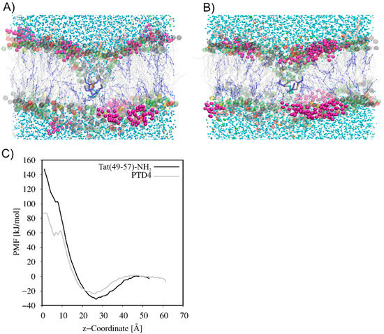 The CG MD simulations were carried out to understand the mechanism of Tat(49–57)-NH2 and PTD4 interactions with the neuronal lipid bilayer. In the beginning, systems with a single peptide molecule were studied. As expected, the peptides, driven by electrostatic interactions, adsorbed quickly on the membrane surface. However, neither of the peptides penetrated the membrane, and both remained attracted to the membrane surface at the end of 10-µs CG-MD simulations (Supplementary Figure S1). Therefore, to induce the movement of peptides across the neuronal lipid bilayer, pulling CG MD simulations were used. As seen in Figure 3, the translocation of peptides was accompanied by the formation of hydrophilic pores and the exchange of water molecules on both sides of the membrane. The PMF curves (Figure 3C) showed the local minimum as the peptides approached the membrane surface. This finding indicates that peptide adsorption on the membrane surface is energetically favorable. A high free energy barrier of 180 kJ mol−1 and 110 kJ mol−1 was observed for Tat(49–57)-NH2 and PTD4, respectively, which prevented the penetration of the peptides into the lipid bilayer. The high energy barrier was formed as a result of strong electrostatic attraction between the positively charged peptide and the negatively charged membrane surface, as well as unfavorable interactions between the hydrophilic peptide and hydrophobic core of the membrane. Thus, the PMF analysis strongly supported the observation that a single Tat(49–57)-NH2 and PTD4 peptide cannot spontaneously cross the lipid membrane.