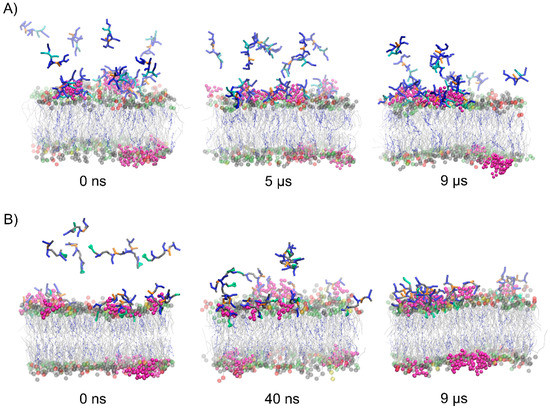 3.2. CG MD Simulations of Spontaneous Peptide–Membrane Interactions
