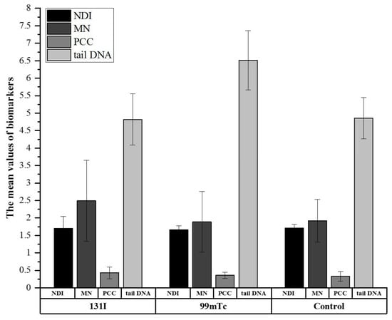 Mean values of biomarkers (NDI, MN, PCC, tail DNA) for human peripheral blood lymphocytes (HPBLs) of the 131I, 99mTc, and control groups. The error bars represent the standard deviation. Tail DNA is DNA damage detected by a single-cell gel electrophoresis assay.