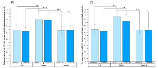 The data presented in Figure 2b confirmed that both low and high (≥100 MET–h/week) WRPE influenced the tail DNA value. There were significant differences in LA WRPE between the 99mTc group and both the 131I group (6.91 ± 0.70 vs. 4.94 ± 0.76, p ≤ 0.05) and control group (4.87 ± 0.62, p ≤ 0.05). Similar to the impact of HA LTPA on the tail DNA value, HA WRPE gave the highest tail DNA value in lymphocytes from individuals in the 99mTc group (6.20 ± 0.88). Furthermore, there were significant differences between the 99mTc group and the 131I group (p ≤ 0.05) and between the 99mTc group and the control group (p ≤ 0.01).