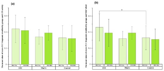For both NA and HA LTPA, the highest amount of excess PCC fragments was detected in the 131I group (Figure 3a). There was no significant difference in excess PCC fragments between NA and HA LTPA in any of the studied groups or between the three groups. By contrast, the excess PCC fragments for NA WRPE were significantly different between the 131I group and the control group (p ≤ 0.05). The differences within the studied groups between NA and HA WRPE were not significant.