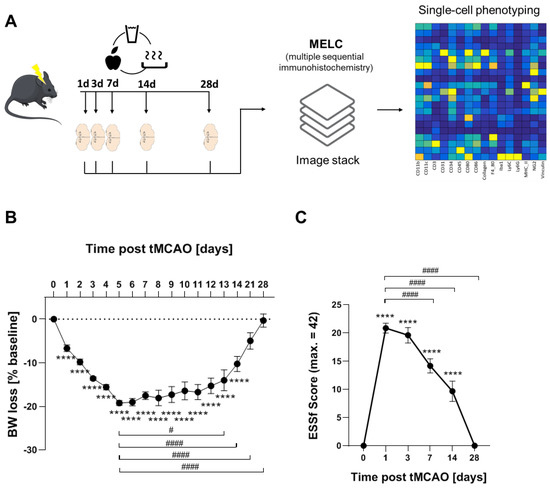 In total, 25 male C57Bl/6J mice (25–30 g) at the age of 10 to 12 weeks old were purchased from Charles River Laboratories (Sulzfeld, Germany). The right middle cerebral artery was occluded as described previously [23]. In brief, mice were anesthetized using 1.5% isoflurane administered continuously via a breathing mask and kept on a temperature-controlled heating mat throughout surgeries. The right common and external carotid arteries were ligated before the insertion of a standard silicone-coated monofilament (6-0 medium, coating length 9 mm, catalog No. 6023910PK10; Doccol, Sharon, MA, USA) until the branching point of the middle cerebral artery. After 1 h, the filament was retracted to allow reperfusion. To achieve analgesia 0.1 mg/kg bodyweight buprenorphine was injected i.p. 30 min before surgery and every 8 h during the first 48 h. Up to 5 animals were grouped into cages and kept on a heating mat (Beurer, Ulm, Germany). The body weight, rectal temperature and clinical signs of pain, agitation or severe apathy were monitored daily. Functional scoring was performed on day 1, 3, 7, 14 and 28 after surgery, using the Experimental Stroke Scale (ESSf) developed by Lourbopoulos et al. [22]. This score comprises 11 items testing for sensory and motor dysfunction, neglect, behavioral and coordination deficits. To secure an adequate food and water supply, we followed the maximized post-stroke support protocol described before including easily accessible jelly food, oral feeding support and s.c. injections of warmed 0.9% saline adjusted to the animals’ individual demand. The mortality rate was 24% including 3 mice that were excluded due to signs of herniation, subarachnoid hemorrhage, or late-onset ischemia. Surviving animals were followed-up for 24 h, 3 d, 7 d, 14 d or 28 d post-stroke, grouping 5 animals per observation timepoint. All procedures have been conducted in an unblinded and unrandomized manner as all animals received the same treatment and no intervention (e.g., drug administration) was performed. A total of 4 animals per group were used for MELC analysis. An overview of the study design is given in Figure 1A. All brains were examined macroscopically for signs of subarachnoid hemorrhage after removal. Tissue sections were macroscopically examined for blood-clot formations.