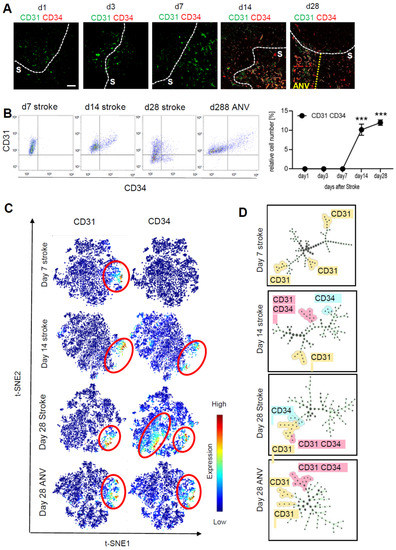 Analysis of neoangiogenesis over time of the stroke area. (A) Representative MELC images showing CD31 and CD34 staining in healthy tissue, stroke area (S) and the ischemic core area of neovascularization (IC-ANV) at the indicated times. The white bar represents 100 µm. (B) Quantitative assessment of CD31+/CD34+ endothelial cells based on the MELC images using flow cytometry standard format in the ischemic core and IC-ANV. Data are shown as mean ± S.E.M (n = 4). One-way ANOVA/Bonferroni *** p < 0.001. (C) tSNE maps with highlighted CD31 and CD34 expression at the indicated times. (D) Identification of cell subpopulations and cell transitions using SPADE analysis at the indicated times in the ischemic core and IC-ANV.