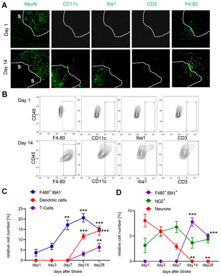 Analysis of immune cell recruitment to the stroke area. (A) Representative MELC images showing stroke-affected (S) and unaffected areas at day 1 and 14 after stroke induction. The white lines depict the borders between the two areas. The white bar represents 100 µm. (B–D) Quantitative analysis of immune cells based on the MELC images using flow cytometry standard format in the stroke-affected regions. Data are shown as mean ± S.E.M. (n = 4). One-way ANOVA/Bonferroni ** p < 0.01; *** p < 0.001.