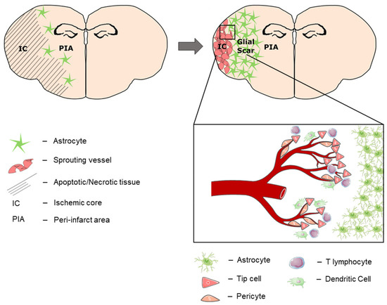 Ischemic stroke is a highly prevalent vascular disease that carries a relevant burden of disability and socioeconomic strain. It is a consequence of the acute occlusion of a cerebral artery leading to oxygen- and glucose deprivation in the brain parenchyma of the respective vascular territory. In this context, the activation of microglia and rapid deterioration of neurons occurs, leading to the release of damage-associated molecular pattern molecules (DAMPS) and thereby to further glial activation and subsequent secretion of cytokines and matrix metalloproteinases [1]. As a result, disruption of the blood–brain barrier (BBB) takes place, which paves the way for immune cell infiltration into the otherwise strictly immunologically privileged brain [2]. In the course of astrocyte activation, a broad glial scar forms around the ischemic border, virtually sealing the ischemic core (IC) off from the peri-infarct area. Whether it represents a protective mechanism keeping the surviving parenchyma separated from the inflamed and necrotic tissue or whether this separation in fact hinders regenerative processes to expand into the ischemic core is not yet clearly understood [3,4].