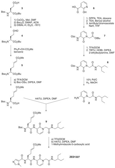 The synthesis of ZED1227 consisted of a parallel multi-step synthesis of two building blocks (1 and 2). The chiral Michael-acceptor-containing building block (1) was obtained by starting with the commercially available Boc (tert-butyloxycarbonyl) protected (L)-glutamic acid tert-butyl ester (3). After methylation of the carboxylic acid side-chain, the introduction of a second tert-butyloxycarbonyl protecting group (intermediate compounds not shown in Figure 1) was known to be essential to minimize the nucleophilicity of the nitrogen atom, as otherwise the subsequent reduction leads to a mixture of products [37,38]. The di-Boc-protected methyl glutamate was reduced to the corresponding aldehyde (4); subsequent Wittig olefination introduced the E-configured Michael acceptor moiety (5). Deprotection of the amino group and cleavage of the tert-butyl ester was followed by mono-Boc protection to yield building block 1.