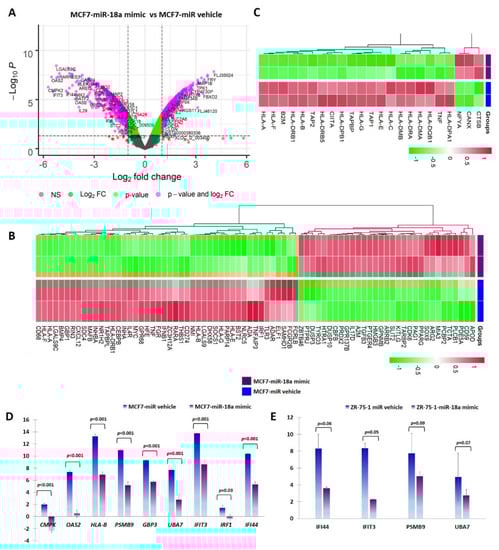 miR-18a was over-expressed using a synthetic mimic for hsa-miR-18a-5p in ER+ cell lines MCF7 and ZR-75-1 as previously described []. To identify putative target genes and specific pathways regulated by over-expression of miR-18a, mRNA microarray analysis of RNA isolated from MCF7-miR-18a-mimic was performed. The effectiveness and specificity of miR-18a over-expression has also been described in detail previously []. Functional enrichment and pathway analysis suggested a global suppression of immune-related pathways (Figure 1A, B). Analysis of specific immune-related pathways suggested repression of antigen presentation (Figure 1C), cytokine production and signaling (Supplementary Figure S1), type I interferon signaling pathway (Supplementary Figure S2), and TAP1 binding and neutrophil activation (Table 1). Down-regulation of specific genes belonging to various immune pathways were also validated using q-PCR after miR-18a over-expression in MCF7 and ZR-75-1. The decreased expression of the following down-regulated genes associated with immune modulation were validated: CMPK2 (p < 0.001-MCF7) and IFI44 (p < 0.001-MCF7, p = 0.06-ZR-75-1); cytokine-signaling-associated genes OAS2 (p < 0.001-MCF7), PSMB9 (p < 0.001-MCF7, p = 0.09-ZR-75-1), and GBP3 (p < 0.001-MCF7); interferon-signaling-associated genes UBA7 (p = 0.001-MCF7, p = 0.07-ZR-75-1), IFIT3 (p < 0.001-MCF7, p = 0.05-ZR-75-1), and IRF1 (p = 0.03-MCF7); and antigen-presentation-associated gene HLA-B (p < 0.001-MCF7) (Figure 1D,E).