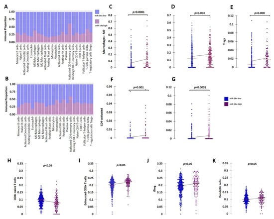 Analysis of immune cell proportions in ER+ miR-18a high- vs. low-expressing tumors. (A) Proportion plot after CIBERSORT analysis depicting immune cell proportions in ER+ tumors of the TCGA cohort (n = 333) segregated based on upper and lower quartiles of miR-18a expression. (B) Proportion plot after CIBERSORT analysis depicting immune cell proportions in ER+ tumors of the METABRIC cohort (n = 506) segregated based on upper and lower quartiles of miR-18a expression. (C) Scattergrams depicting associations between proportions of M0 macrophages and ER+ tumor groups of TCGA and (D) METABRIC segregated based on upper and lower quartiles of miR-18a expression as analyzed by CIBERSORT. (E) Scattergrams depicting associations between proportions of Tregs and ER+ tumor groups of TCGA. (F) Scattergrams depicting associations between proportions of CD4 activated cells and ER+ tumor groups of TCGA and (G) METABRIC. (H–K) Scattergrams depicting associations between immune cell type proportions and ER+ tumor groups of TCGA segregated based on upper and lower quartiles of miR-18a expression as analyzed by ImmuneCellAI. Statistical analysis was performed by Mann–Whitney U test. p < 0.05 is considered significant.