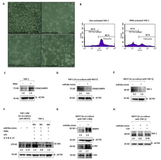 Further, to assay for M1/M2 phenotypic changes induced by MCF7-miR-18a-mimic or MCF7-negative control cells, THP1 cells were differentiated in trans-well inserts with 150 nM of PMA for 24 h and placed with MCF7-miR-18a-mimic or MCF7-negative control cells. Both differentiated THP-1 and MCF7-miR-18a-mimic or MCF7-negative control cells were harvested after 2 days to assay for M1/M2 macrophage markers and to assay the effect on MCF7-miR-18a-mimic or MCF7-negative control cells.