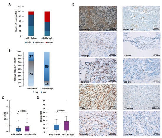 The ER+ tumors from our case series were morphologically analyzed for the TIL density. The stromal immune infiltrate density was qualitatively scored as mild, moderate, and dense. To maximize the specificity, we chose to take a cut-off for miR-18a transcript at the third quartile (third quartile at 9.5) and divided the samples into miR-18a high (n = 22) and low (n = 59). We observed that miR-18a high tumors had the presence of denser TILs when compared to the miR-18a low tumors (p < 0.0001) (Figure 4A). These ER+ tumors (n = 54) were further examined for MMP9 expression by immunohistochemistry assays. In miR-18a high samples, 11/13 samples (85%) expressed high levels of MMP9 as opposed to 11/41 (27%) of miR-18a low tumor specimens (p < 0.0001) (Figure 4B). The miR-18a high and low tumor specimens (n = 15 each) were further used for IHC labeling with CD4 and CD8. We observed that the CD4/CD8 ratio was higher in the ER+ miR-18a high tumor specimens (p < 0.0001) (Figure 4C). We also used CD68, a pan macrophage marker, and CD206, a tumor-promoting M2 macrophage marker for IHC labeling. It was seen that the miR-18a high tumors expressed increased levels of CD206 and a higher CD206/CD68 ratio when compared to the miR-18a low tumors (p = 0.008) (Figure 4D,E), which further supports the in vitro findings. They also reflect the observations seen in tumors from TCGA and the METABRIC cohort using CIBERSORT and ImmuCellAI algorithms. The results are suggestive of miR-18a high tumors being associated with a dense but pro-tumorigenic immune-suppressed stroma.
