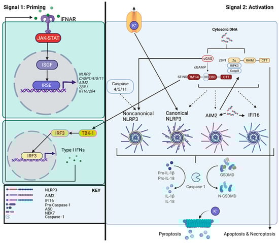 Mechanism of DNA effectors STING, ZBP1, and inflammasome activation in response to DNA. Inflammasome initiation of inflammatory cytokine activation and pyroptosis following nucleic acid stimulation can occur directly in the ALR inflammasomes AIM2 and IFI16. However, inflammasome activation to DNA, particularly by the NLR inflammasome NLRP3, may also be regulated by caspase-11/4/5 activation or the DNA sensing effectors STING and ZBP1. Upon sensing of DNA, effector STING in the cGAS axis induces the production of Type I IFNs, initiating IFN-alpha/beta receptor (IFNAR) and JAK-STAT activation of Interferon-stimulated Response Elements (IRSEs). This, in turn, promotes priming of inflammasome components and DNA effectors. The DNA sensing effector ZBP1 also initiates inflammasome activation and multiple forms of cell death in the proposed PAN-optosome pathway of cell death [,,,,,,,,,]. Created with BioRender.com (Agreement #AG23XLKR9E; accessed on 16 May 2022).
