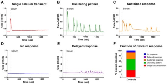 A careful analysis of the responses revealed that RC displayed different patterns of Ca2+ signals, which we classified into five categories: a single Ca2+ transient (Figure 2A), a Ca2+ transient followed by an oscillating pattern (Figure 2B), a Ca2+ transient followed by a phase containing sustained Ca2+ elevation (Figure 2C), no response at all (Figure 2D), or a delayed response without the initial Ca2+ transient in around 5% of cells (Figure 2E). Overall, 92% of the RC presented a clear Ca2+ elevation, corresponding to the first three categories (Figure 2F). These different patterns of responses were consistently observed despite the primary cells coming from different donors (seven different donors in these experiments). Hence, these results highlight that the RC population is highly heterogeneous in its Ca2+ response to serum stimulation.