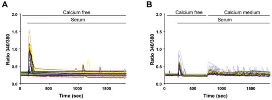 Extracellular Ca2+ is required to sustain the oscillatory responses. Myoblasts were differentiated for 48 h to obtain myotubes and RC. The cells were loaded with Fura-2 and stimulated by 15% serum. (A) In a Ca2+-free medium, the Ca2+ response was only transient. (B) Ca2+ oscillations resumed when Ca2+ was readded in the extracellular medium. Each panel is the representative response of n = 41 reserve cells (A) and n = 21 reserve cells (B) acquired in two independent coverslips.